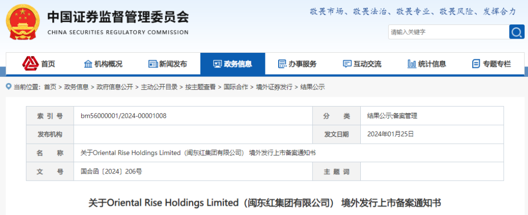 12月21日,中国证监会国际合作部发布关于Oriental Rise Holdings Limited(闽东红集团有限公司) 境外发行上市备案通知书。