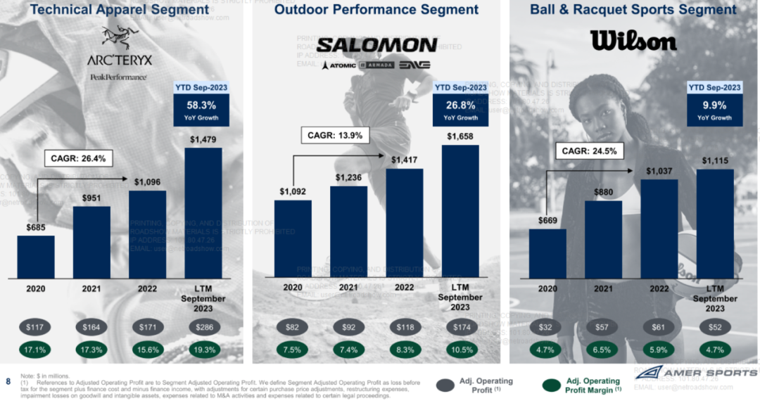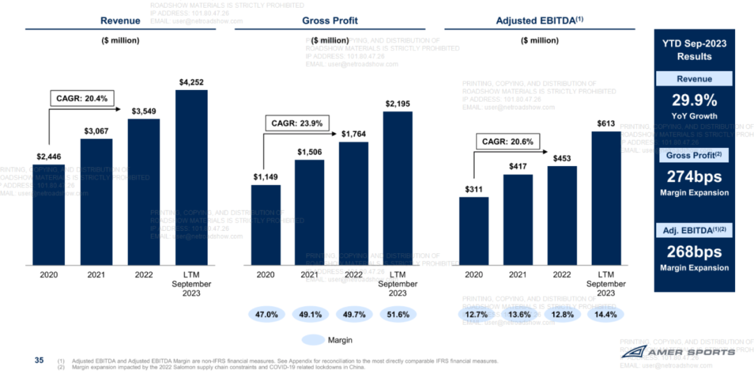 2023年前三季度,亚玛芬体育的营收同比增长29.9%至30.53亿美元,毛利率从2022年同期的49.4%增至52.2%,调整后EBITDA则从2022年同期的2.62亿美元增加61.3%至4.22亿美元。