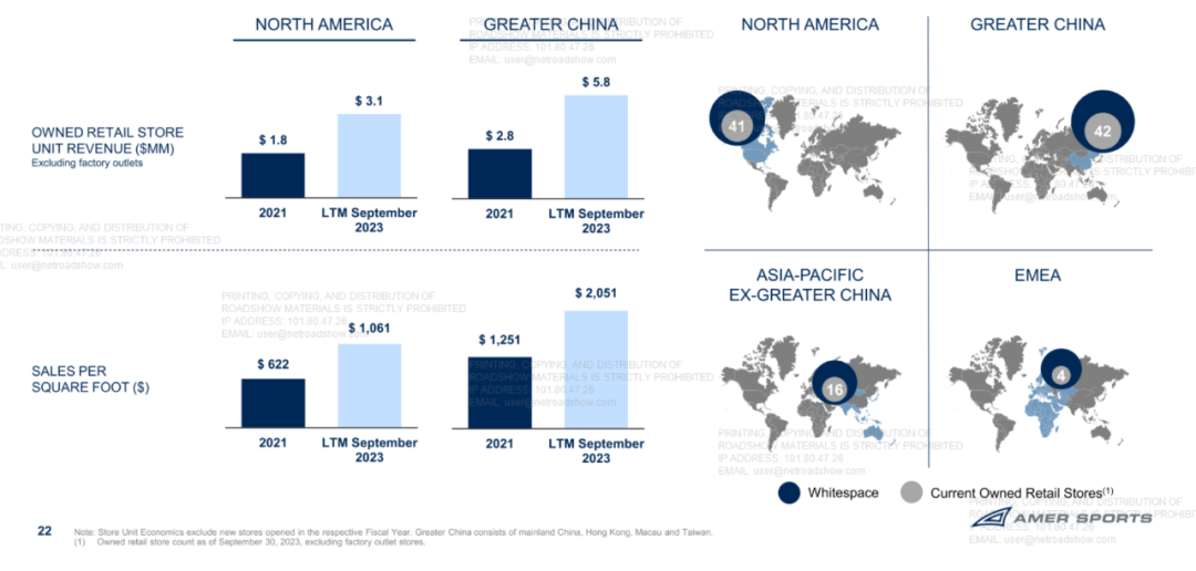 企业以更专注于细分市场中具有巨大市场机会和巨大上升潜力的核心品牌。截至2023年9月30日,亚玛芬体育在全球24个国家拥有超330家自营零售店。