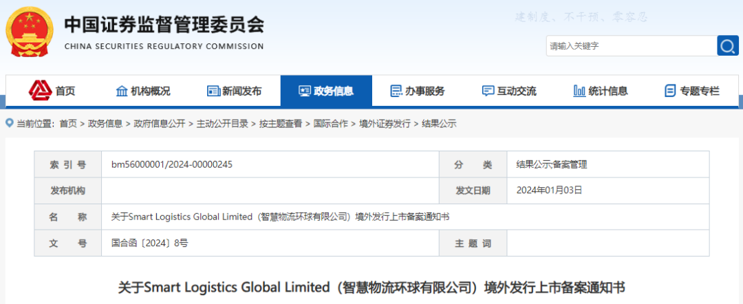 1月2日,中国证监会国际合作部发布关于智慧物流环球有限公司境外发行上市备案通知书。