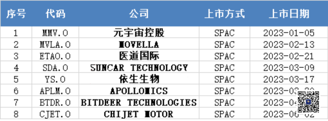 2023年至今,共有8家中国公司以SPAC借壳方式在美国纳斯达克挂牌上市,分别是元宇宙控股、迈柯博(Movella)、医道国际、盛大科技(Suncar)、依生生物、冠科美博(Apollomics)、比特小鹿(Bitdeer)及驰捷汽车(Chijet Motor)。