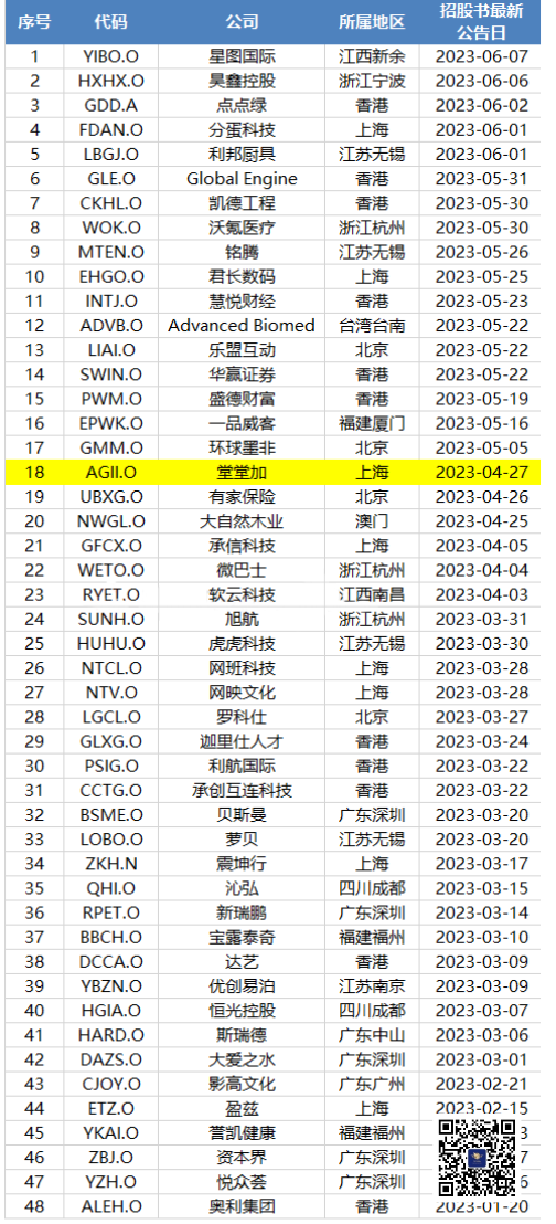 截至6月7日,2023年以来,共有48家排队上市的中概股向美国SEC递交或更新了招股书,其中,堂堂加(AGII.O)预计将于6月19日挂牌上市。