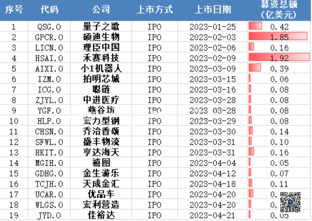 2023年至今,共有19家中国公司通过IPO的方式在美国纳斯达克上市,合计募资6.03亿美元。